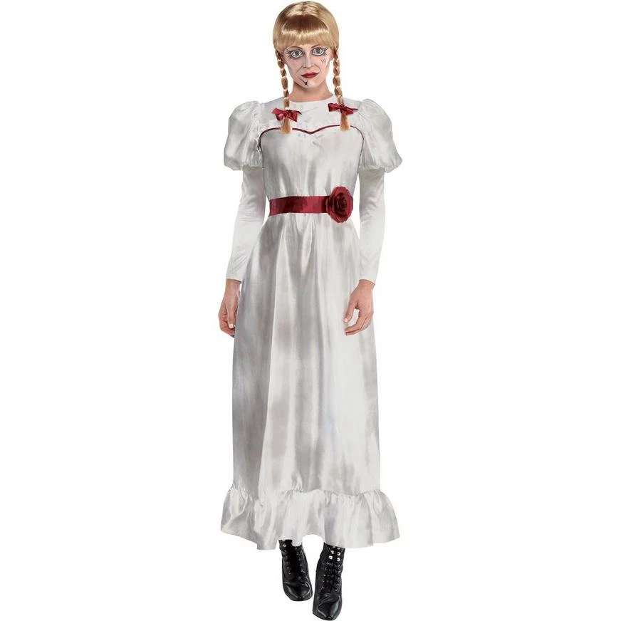 More on Annabelle Comes Home Annabelle Costume: Get prepared to spook the crowd dressed in this Annabelle Costume for adults! The polyester long-sleeved dress features puff shoulders, red trim along the sweetheart neckline, and a satin ribbon flower around the waist. Also included is a blonde wig designed after Annabelle’s iconic braided pigtails and blunt-cut bangs. Review the size chart for additional information. Shoes and makeup not included.