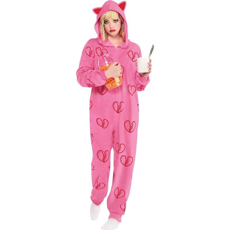 Cheer up Puddin’, he’s just a Joker! Get into the cute, cozy, and heart-broken side of Harley Quinn with this pink polyester onesie. This soft and fuzzy costume features a cat-ears hood, a front zip closure, and an adorable print of broken hearts.