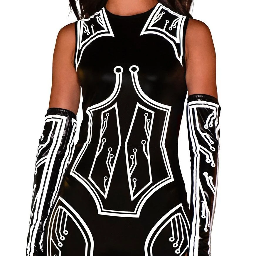 Adult Reflective Black Latex-Look Circuit Board Sleeveless Unitard Catsuit product details: