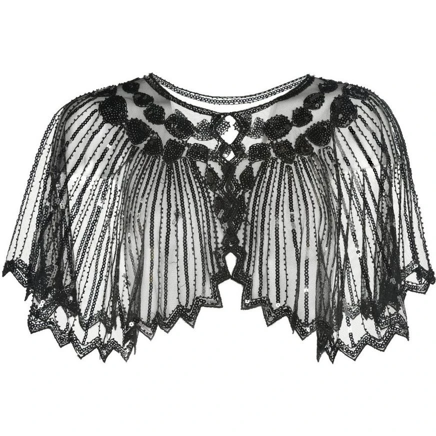 Top off your roaring 20s ensemble with this stunning capelet to instantly elevate your look. It’s made of sheer mesh with an art deco-inspired design made of black sequins and beading.