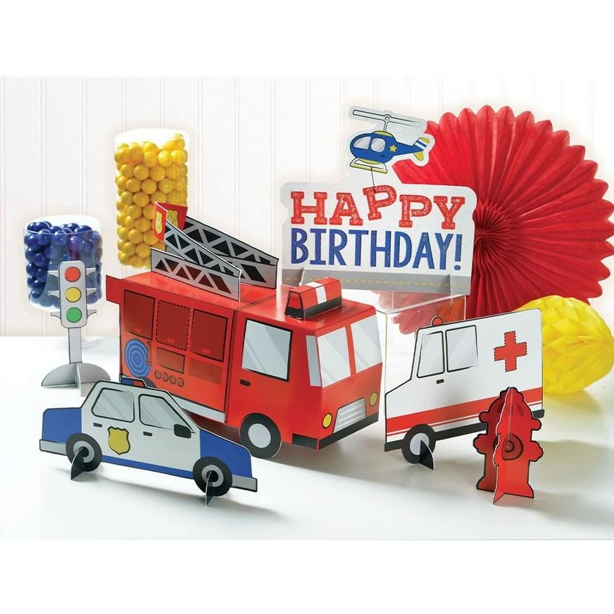 Never fear, first responders are here to help make decorating a piece of cake. The centerpiece set includes cardstock emergency vehicles, stop lights, fire hydrants, and more. They’re perfect additions to the buffet or dining table at your child’s first responders-themed birthday party.