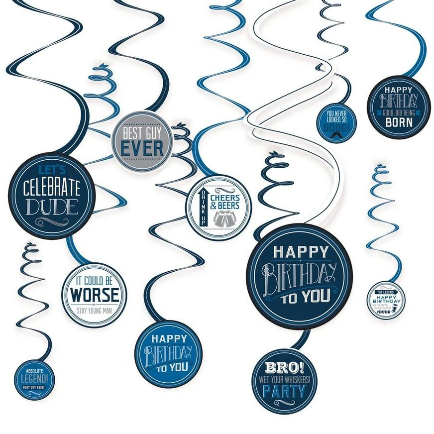 Set the scene for a surprise birthday party by decorating with Happy Birthday Classic Swirl Decorations! These blue and dark blue swirl decorations feature round blue, silver, and white cardstock attachments. The attachments feature headlines such as “Let’s Celebrate Dude, “Best Guy Ever,” and more. Pair these swirl decorations with other blue, silver, and white birthday decorations!