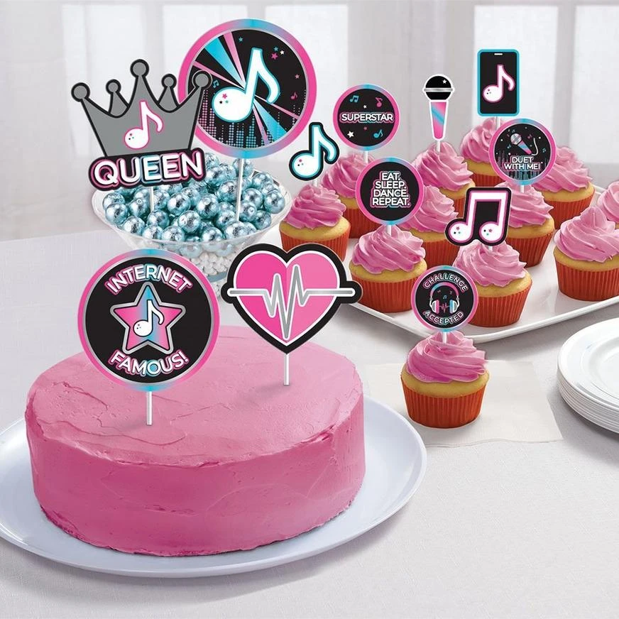 Add a super-fun touch to your little star’s birthday treats with a dessert decorating kit! The kit includes four large picks: a silver crown, a heart, a musical note, and an “Internet Famous” headline. Eight small picks have music-inspired messages like “Superstar.” Top cakes, candy displays, cupcakes, and other tasty treats with these colorful decorations.