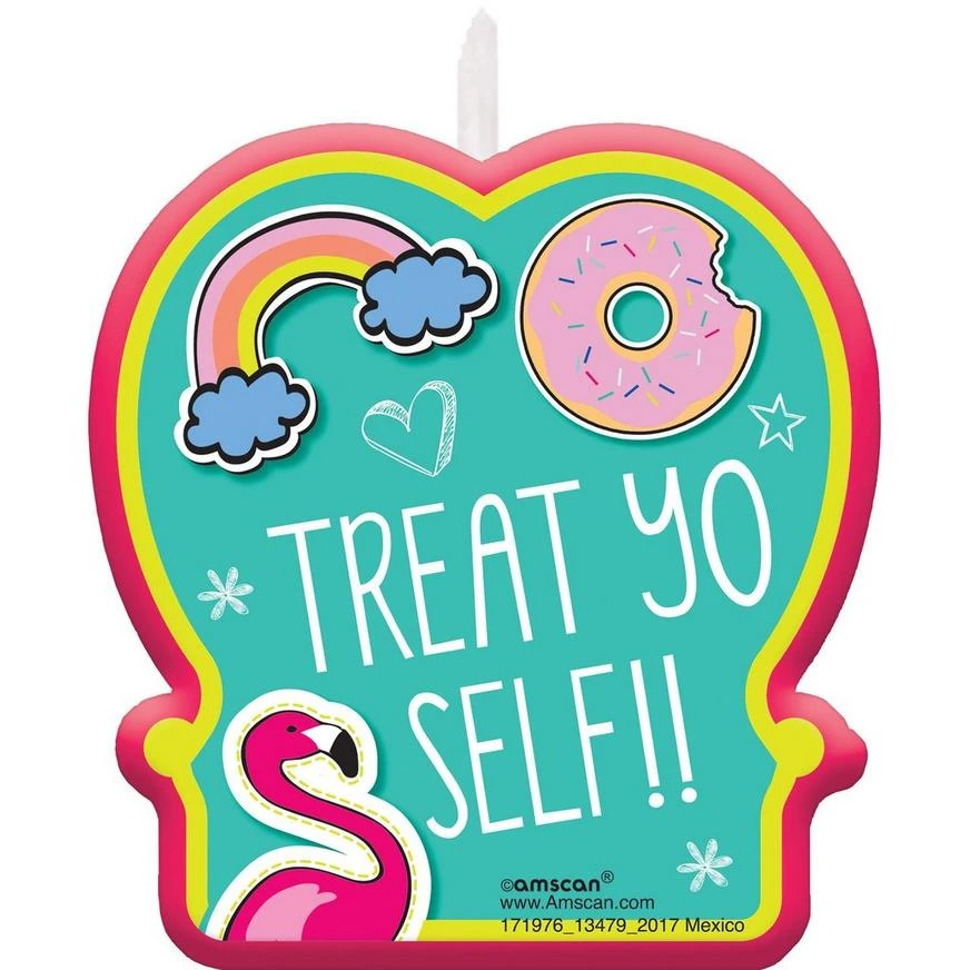Treat them to something sweet and top it off with this Selfie Celebration Birthday Candle! This pink wax candle features a sticker with a rainbow, donut, and flamingo printed on it. The headline “Treat Yo Self!!” is written on the candle against a turquoise background. Stick this candle on top of a birthday cake or cupcake for your little one’s birthday party!
