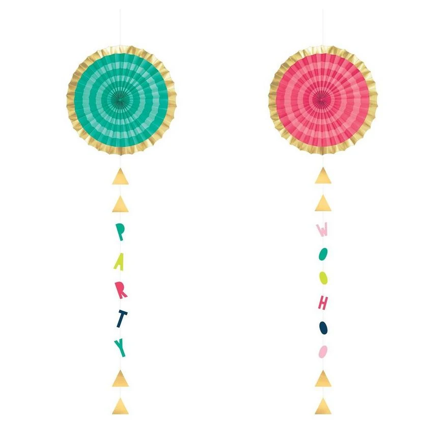 Get ready to party by decorating with Sign of the Times Paper Fan Decorations with Tails! These paper fan decorations come in pink and teal and include attachable tails with colorful letter cutouts that spell out ‘Party’ and ‘Woohoo.’ You can mix and match these paper fan decorations with other colorful decorations. Use these paper fans to decorate for a birthday or any other special occasion!