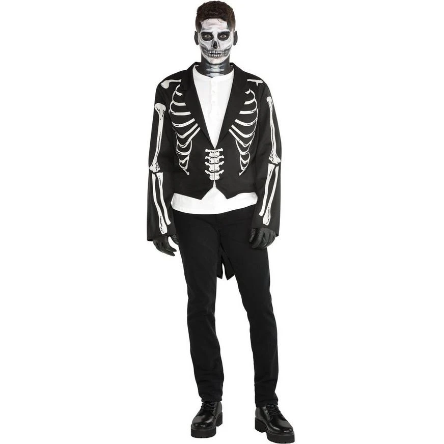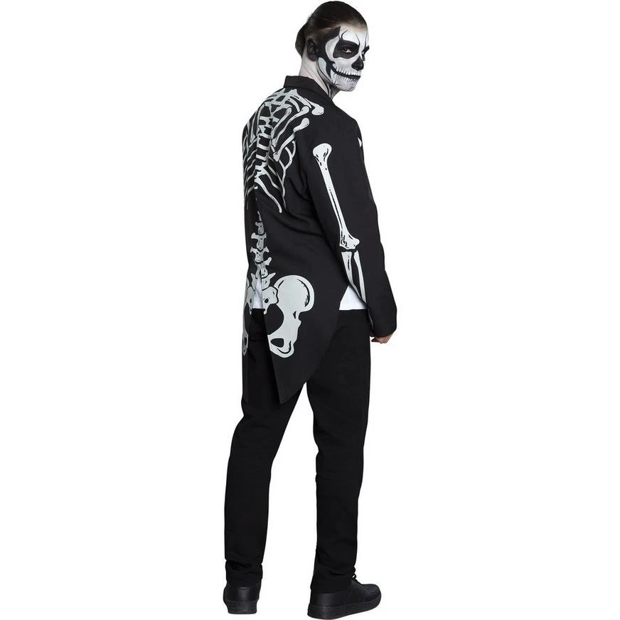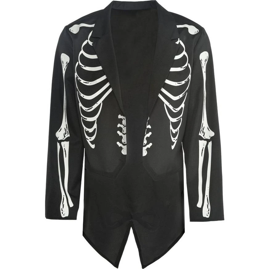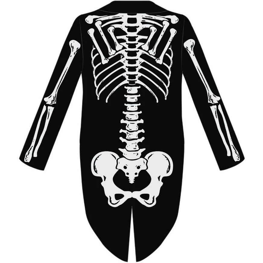 Put a dressy spin on the classic skeleton costume with this black tailcoat. It features bones printed on both sides, a pointed front hem, and an extended split tail in the back.
