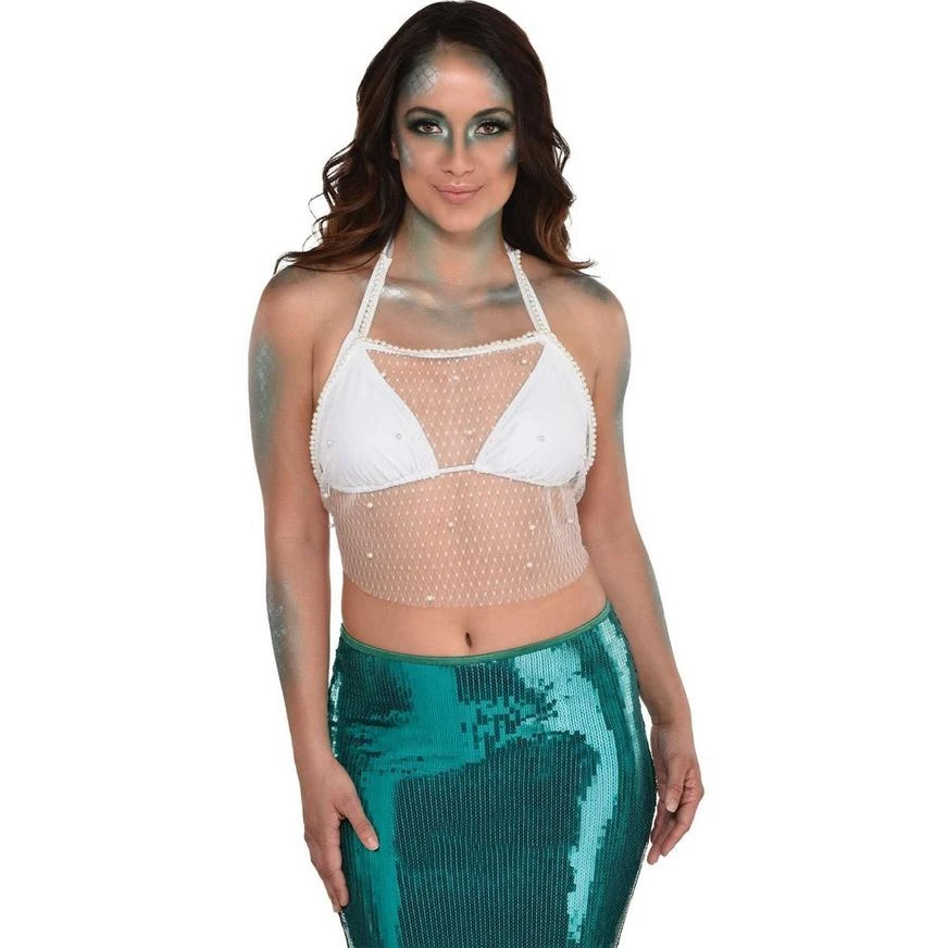 Adult White Beaded Mesh Cropped Halter Top product details: